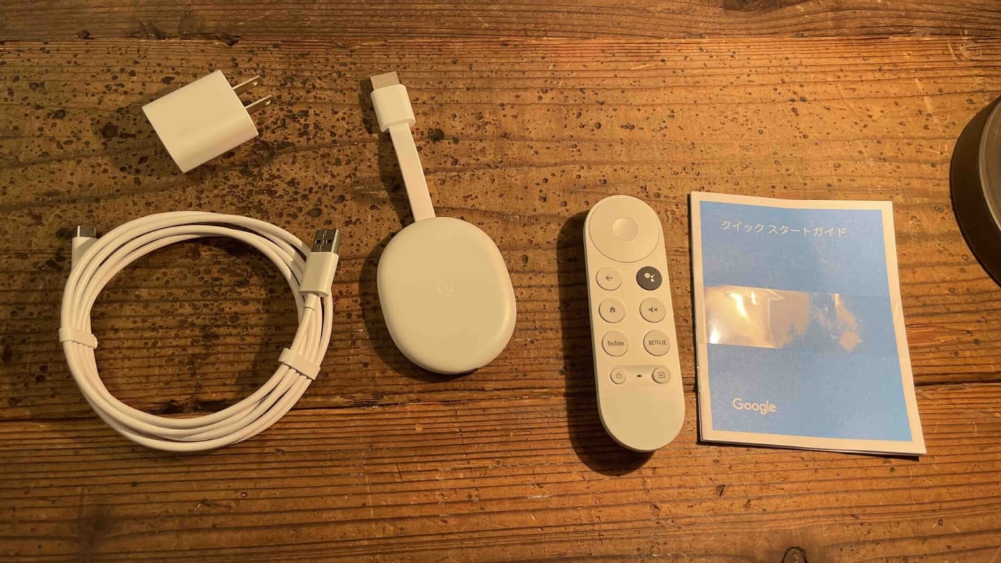 内容物はChromecast本体 リモコン 充電ケーブル(USB Type-A→USB Type-C)電源アダプター 単四電池2本 説明書です。