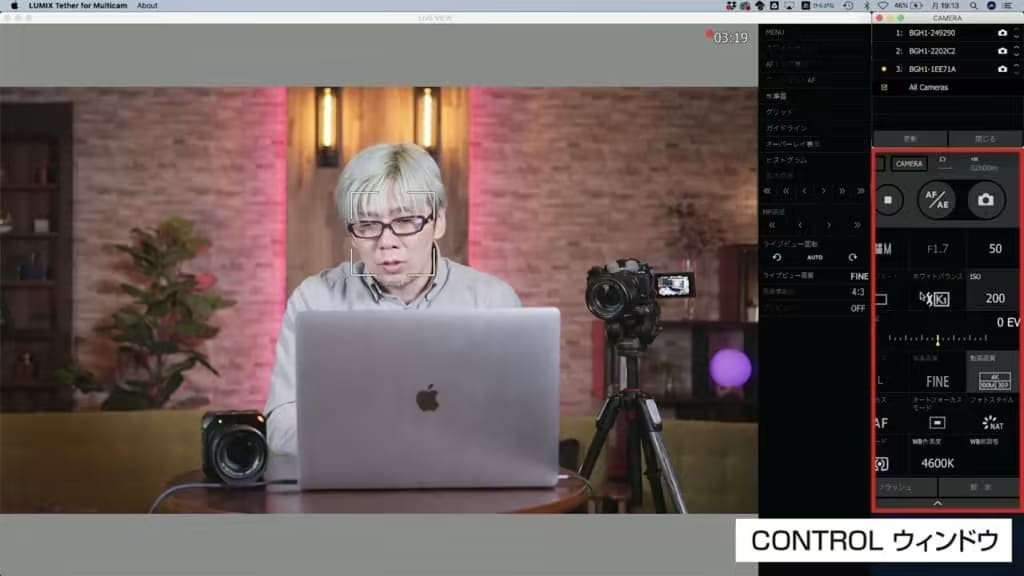 CAMERAウィンドウ で操作したいカメラ選択し、CONTROLウィンドウで ホワイトバランス、ISO 等を個別で設定していきます。